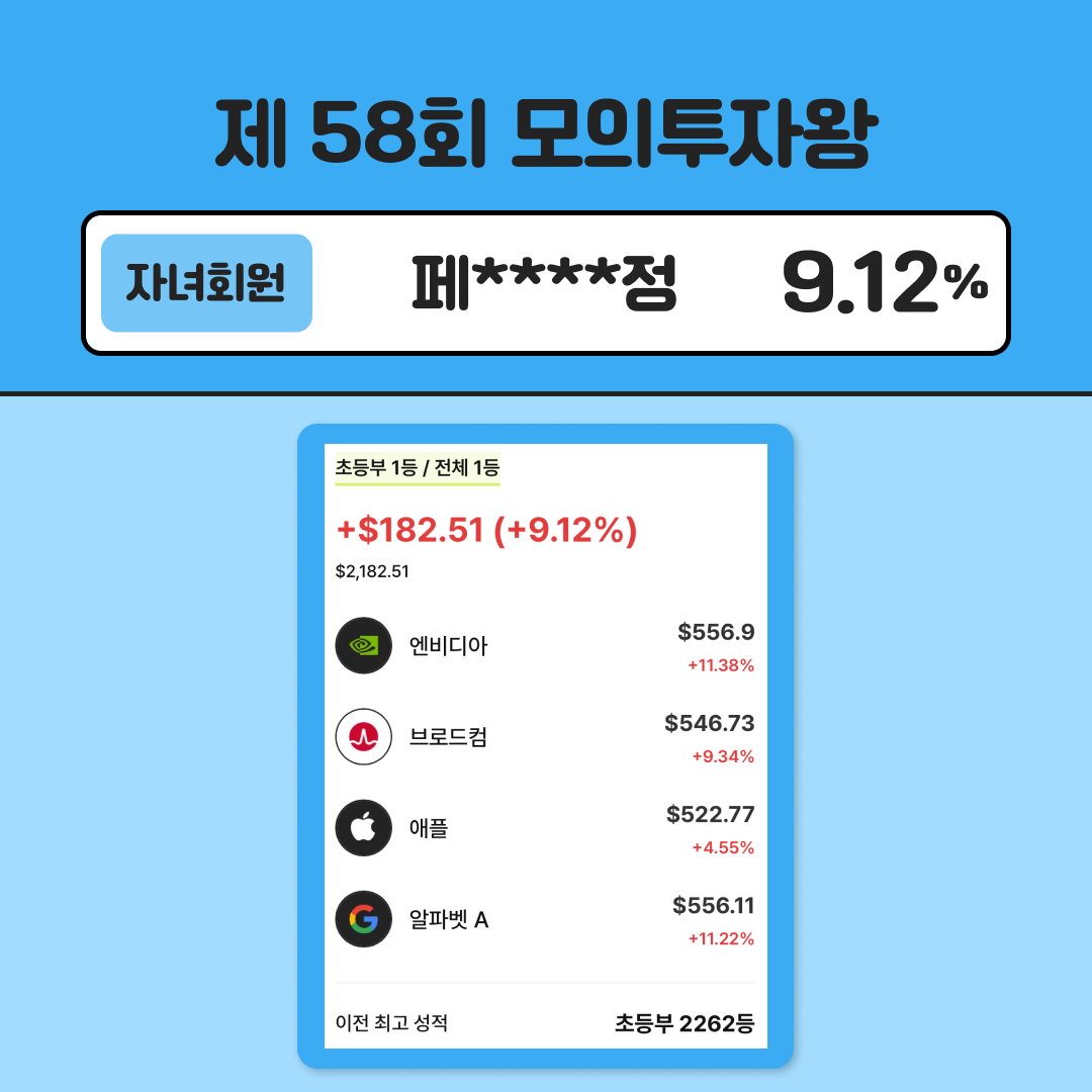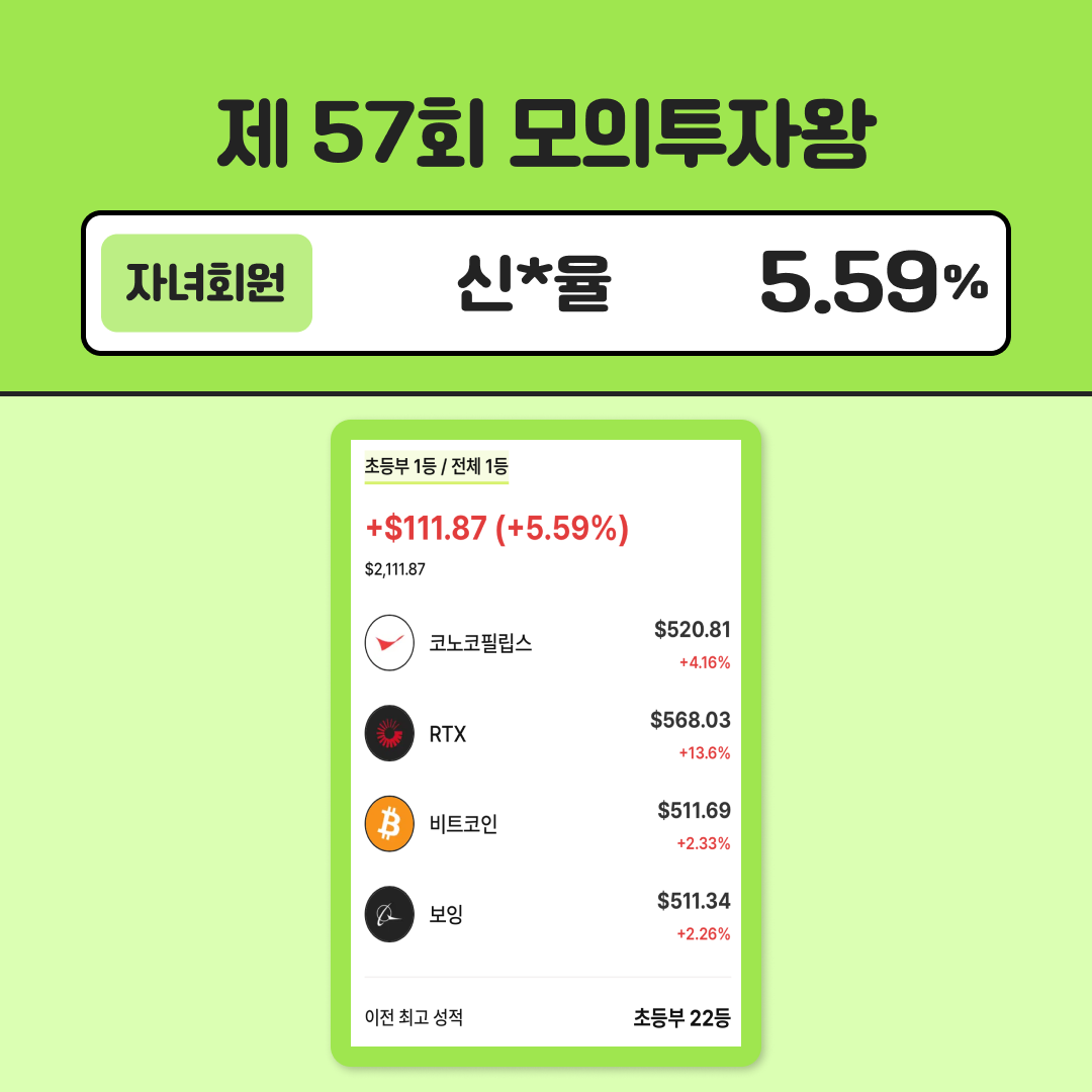이번 모의투자왕🥇1위는 자녀 회원 "페****정"님 축하합니다~!!🎉🎉🎉