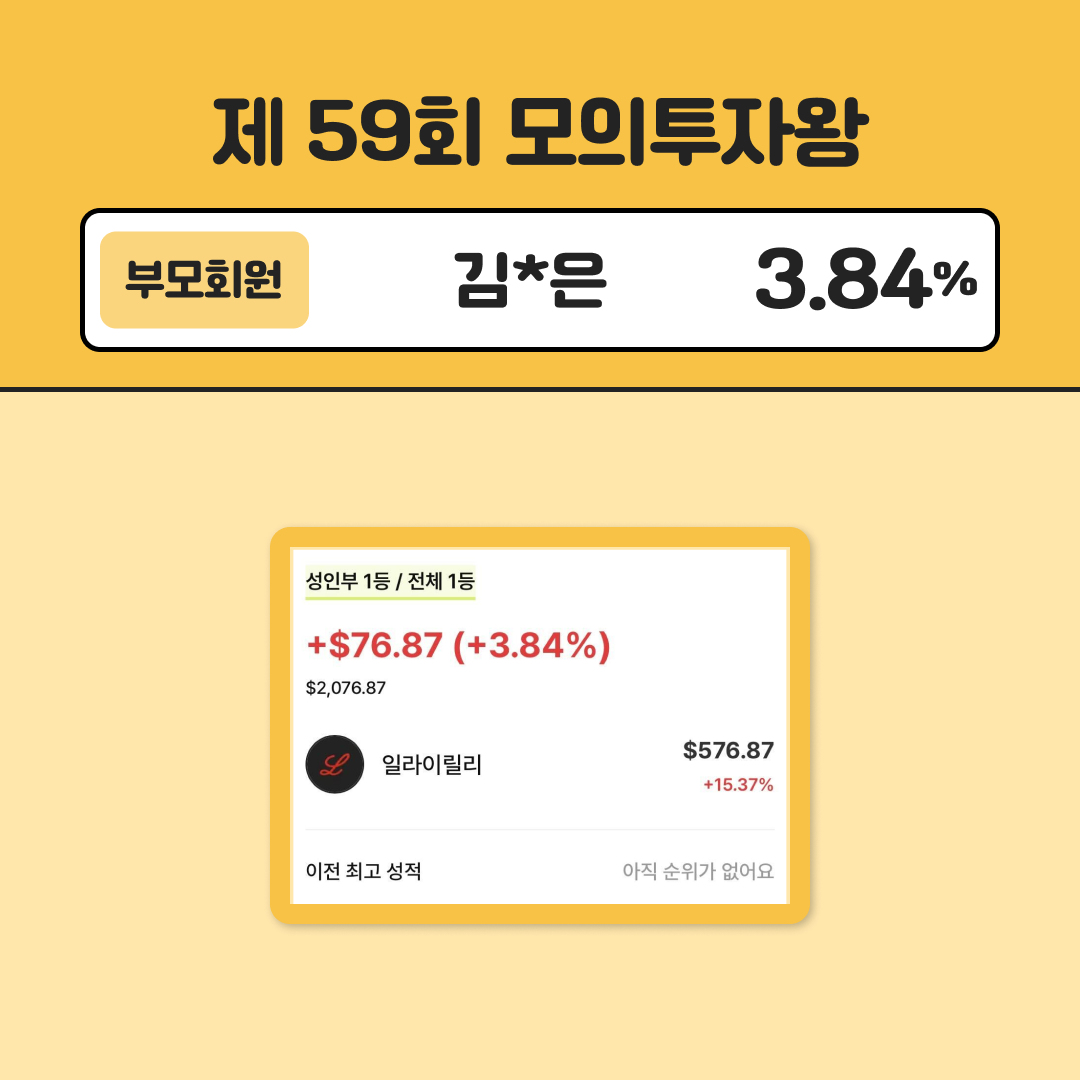 이번 모의투자왕🥇1위는 부모 회원 "김*홍"님 축하합니다~!!🎉🎉🎉