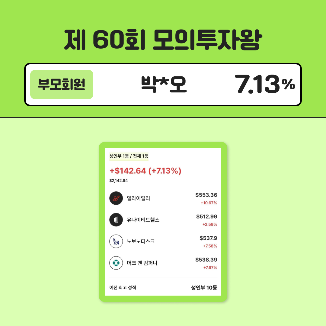 이번 모의투자왕🥇1위는 부모 회원 "박*오"님 축하합니다~!!🎉🎉🎉