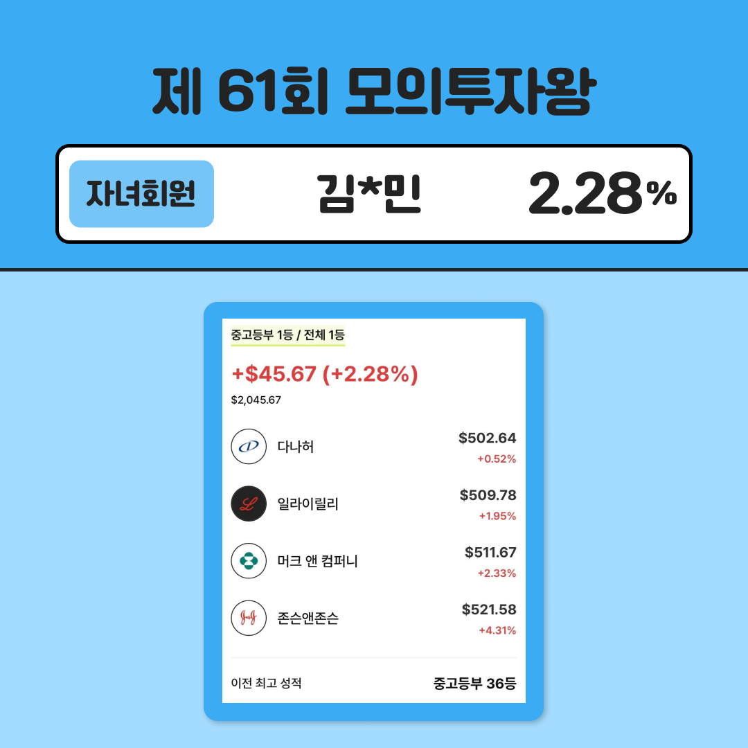 이번 모의투자왕🥇1위는 부모 회원 "김*은"님 축하합니다~!!🎉🎉🎉