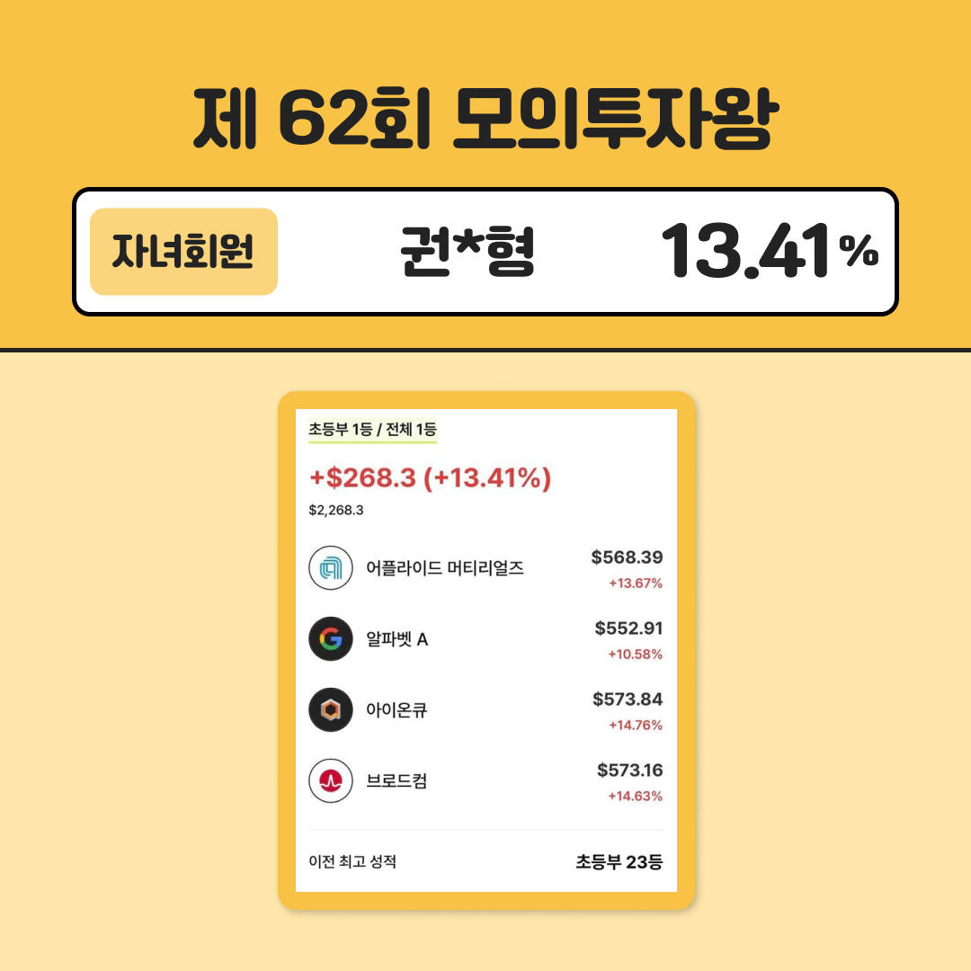 이번 모의투자왕🥇1위는 자녀 회원 "권*형"님 축하합니다~!!🎉🎉🎉