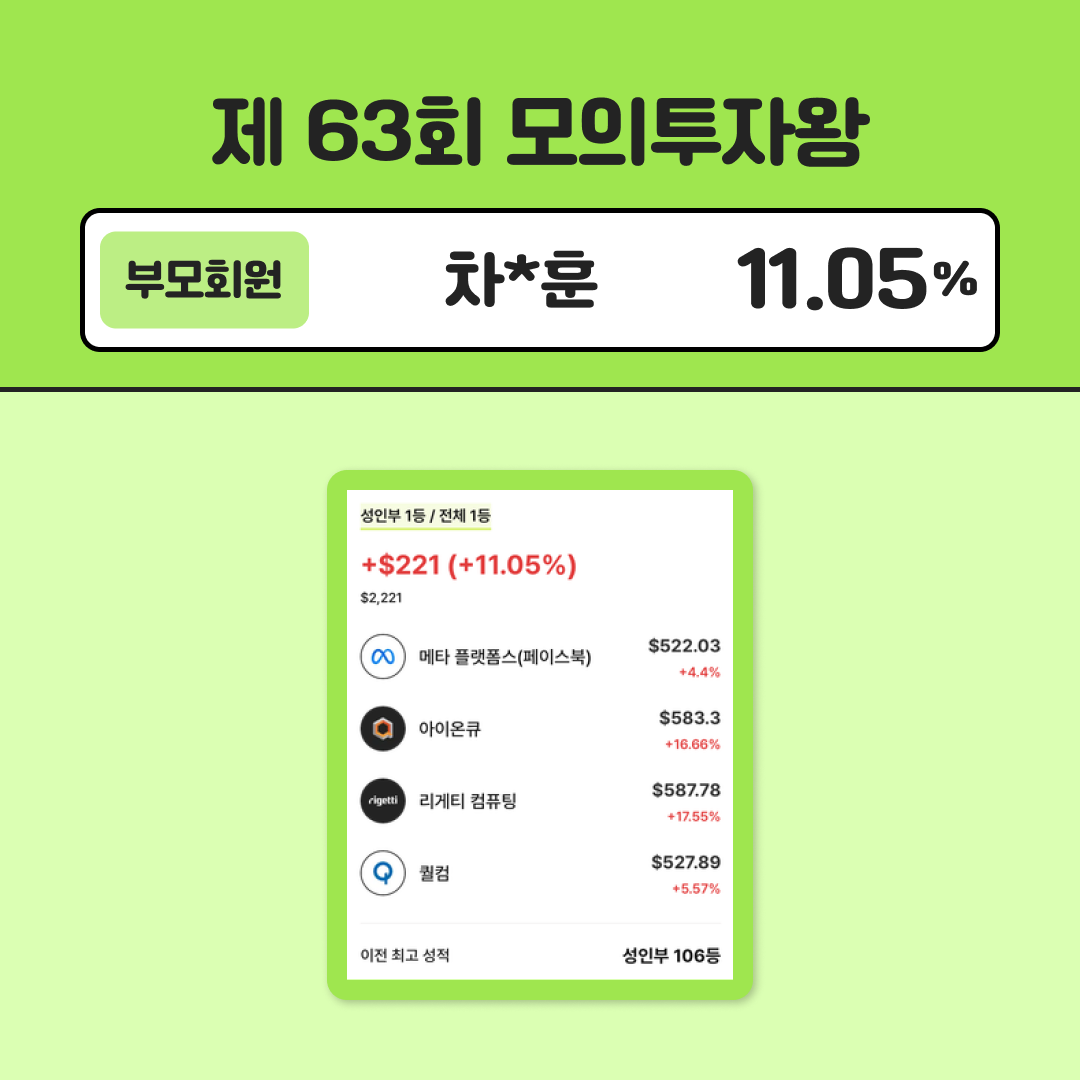 이번 모의투자왕🥇1위는 부모 회원 "김*미"님 축하합니다~!!🎉🎉🎉